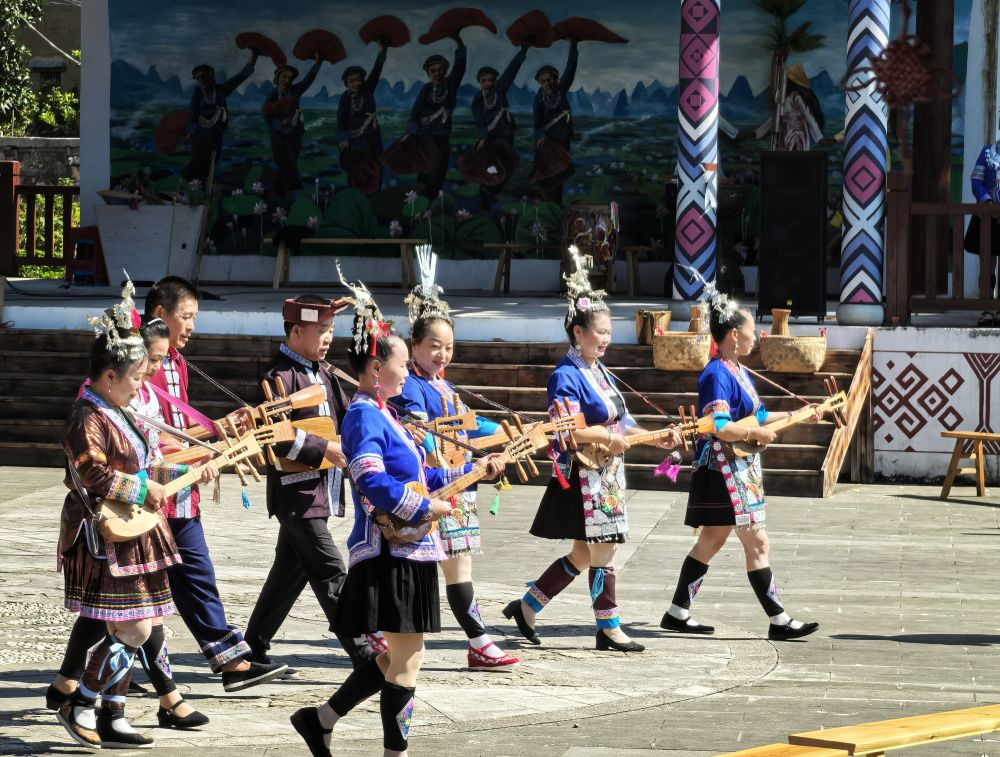 在隘江村陇鉴古寨,村民刚结束一场歌舞表演。新华社记者王楚然 摄