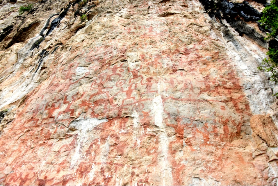 花山,坐落于崇左市宁明县城西北约25公里的明江河畔,以其古老神奇的岩画而闻名海内外。花山岩画距今已有2000多年的历史,刻着人、兽、铜鼓、刀剑、羊角钮钟等造型各异的赭红色图像,记录着壮族先民古骆越人的生活、生产和宗教信仰,为中国首个岩画类世界文化遗产。