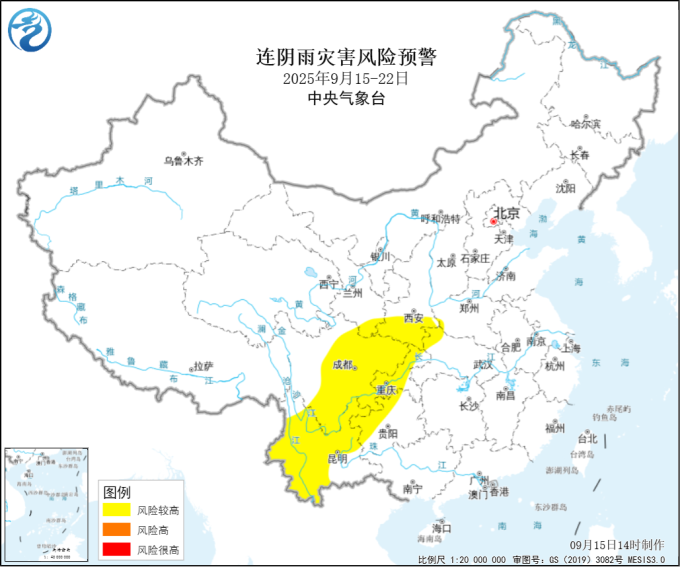 四川、重庆、云南、贵州西部、甘肃南部、陕西南部、湖北西北部等地秋收连阴雨风险较高(黄色预警),不利于作物收获晾晒。